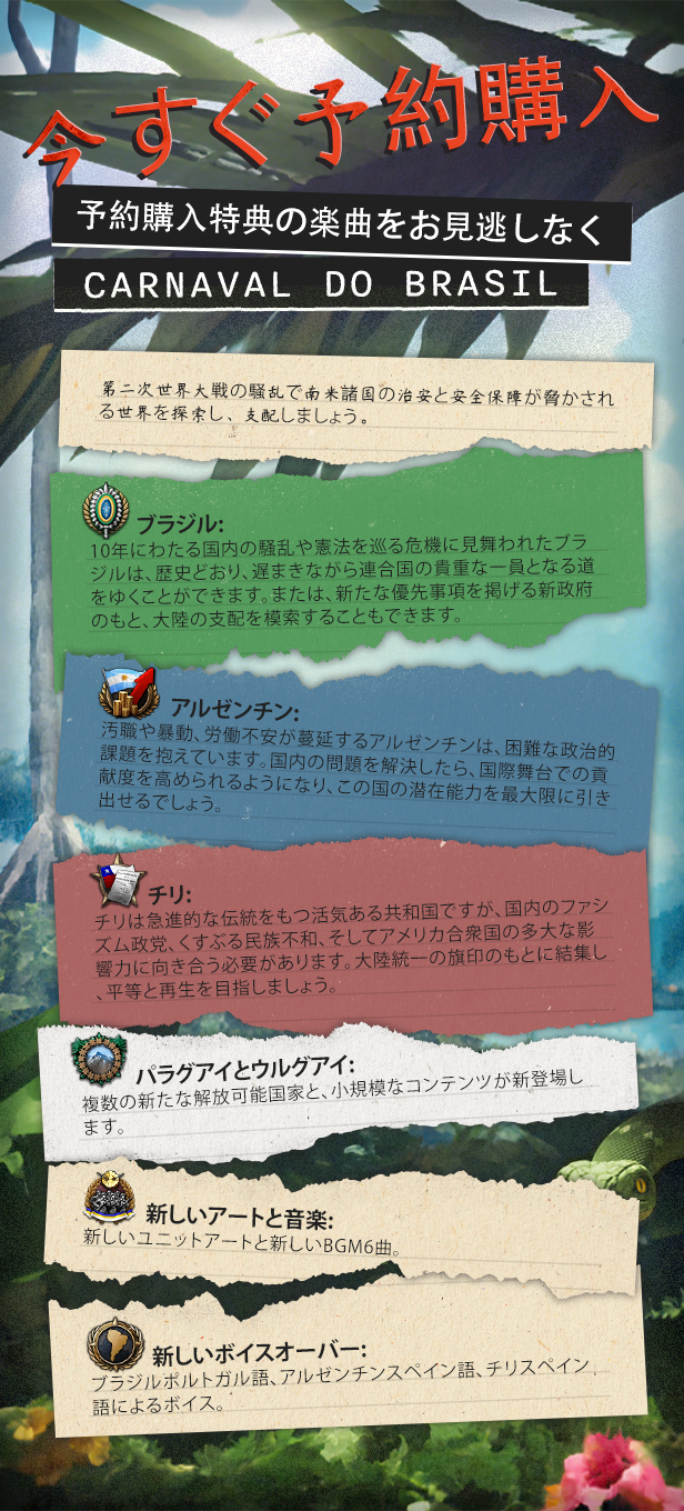 Hearts of Iron IVの新コンテンツパックTrial of Allegianceで、世界で最もドラマチックな戦いの新たな歴史を書こう。第二次世界大戦の騒乱で南米諸国の治安と安全保障が脅かされる世界を探索し、支配しましょう。