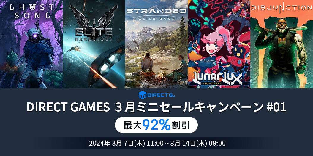 DIRECT GAMES 3月ミニセールキャンペーン #01では、「ゴーストソング」、「エリートデンジャラス」、「Stranded: Alien Dawn」「ルナーラックス」「ディスジャンクション」などを含め、その他にも多数の特価商品を用意したお得なキャンペーンですので、ぜひご確認ください!