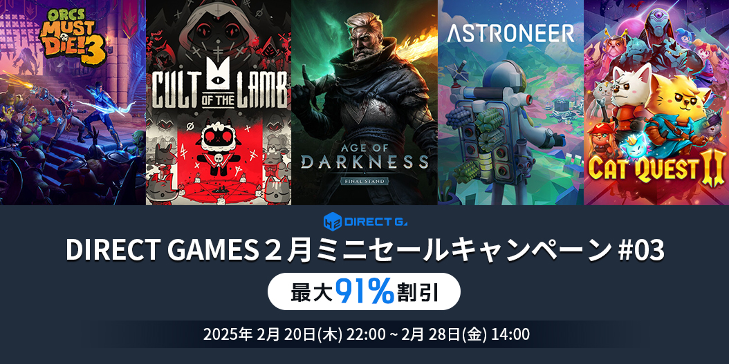 DIRECT GAMES2月ミニセールキャンペーン #03では、「オークス・マスト・ダイ!3」、「カルトオブザラム」、「Age of Darkness: Final Stand」、「アストロニーア」、「キャットクエストII」などを含め、その他にも多数の特価商品を用意したお得なキャンペーンですので、ぜひご確認ください!