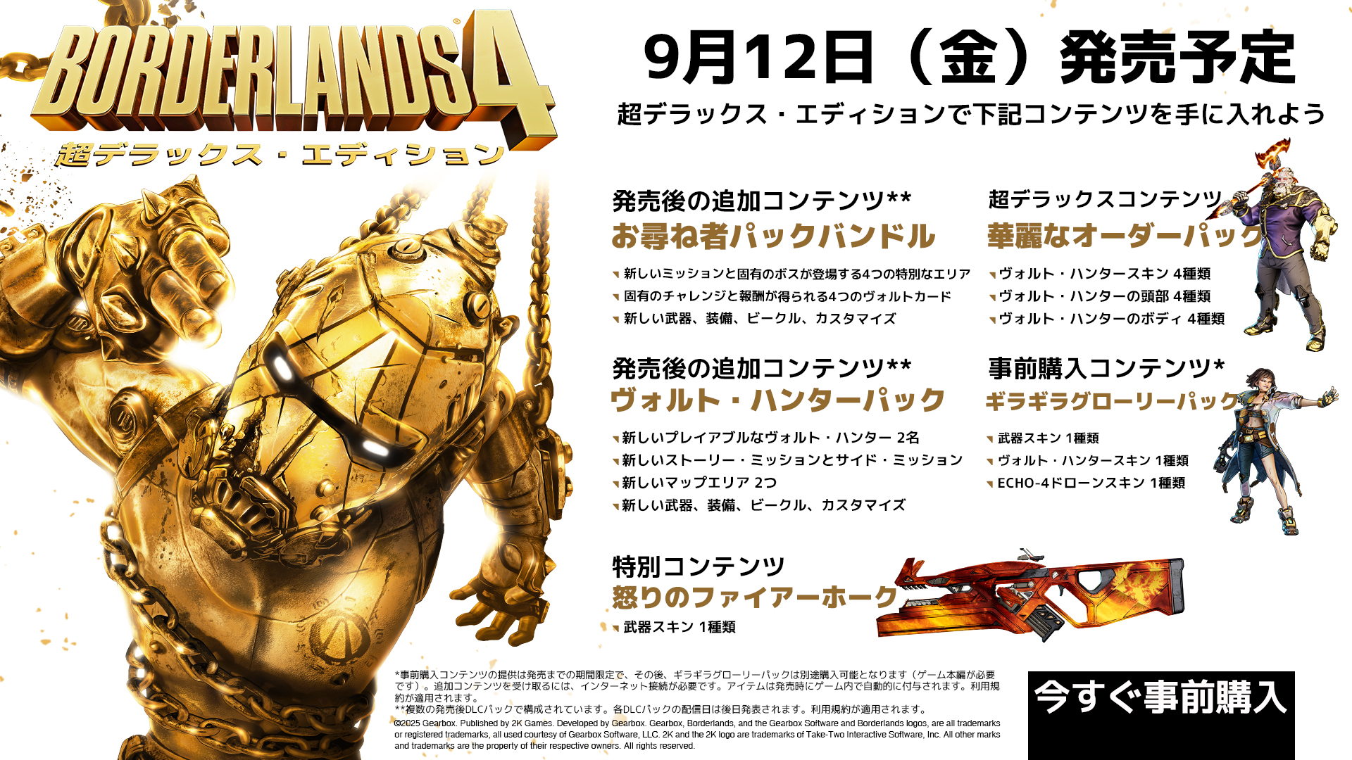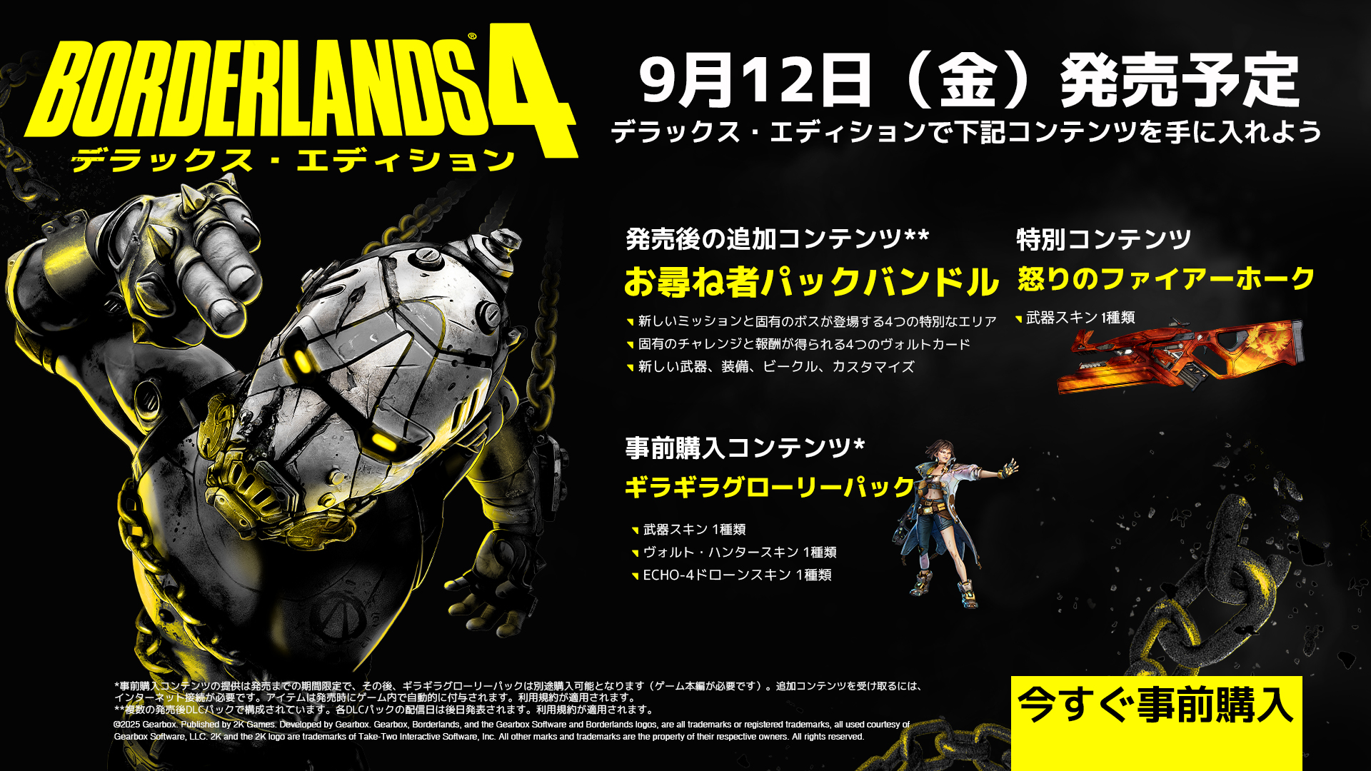 2025年9月12日(金)発売予定の「ボーダーランズ4」予約販売開始を下記のとおりご案内いたします。