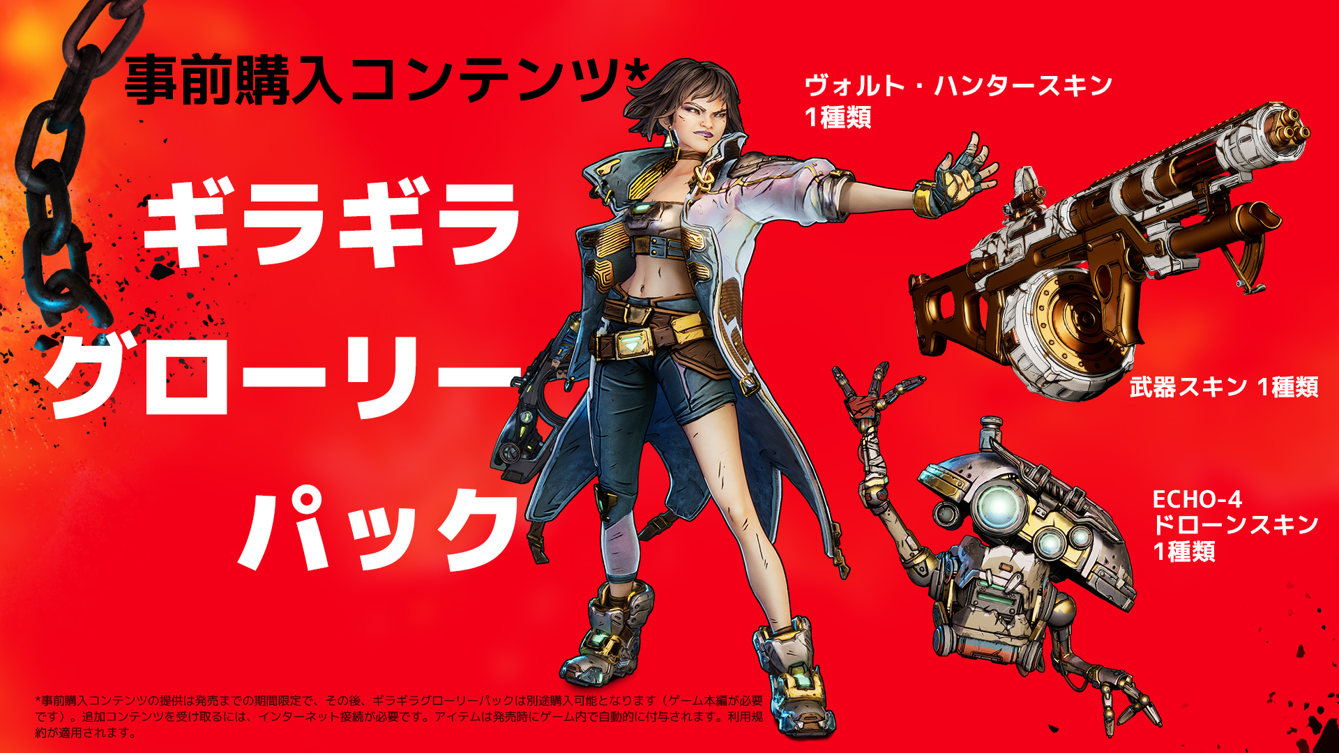 『ボーダーランズ4』を事前購入して、ヴォルト・ハンタースキン、武器スキン、ECHO-4ドローンスキンが含まれる「ギラギラグローリーパック」を受け取ろう!
