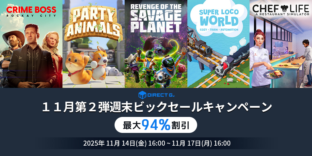 平素よりご利用いただき、誠にありがとうございます。11月7日の本日より、11月第2弾週末ビックセールキャンペーンを実施いたします。PCゲームデジタルキー公式販売サービス「DIRECT GAMES」では毎週末お得なイベントを開催しております。毎回、対象ゲームが変わるPCゲームユーザー必見のお得なキャンペーンですのでぜひご確認ください!