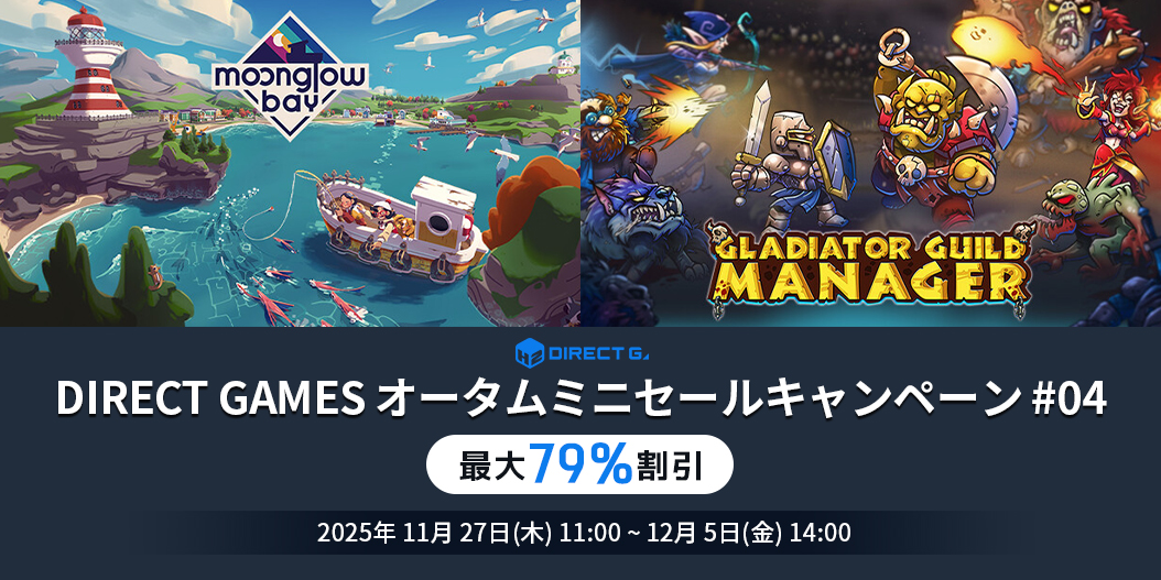 DIRECT GAMES オータムミニセールキャンペーン #04では、「Moonglow Bay」、「Gladiator Guild Manager」などを含め、その他にも多数の特価商品を用意したお得なキャンペーンですので、ぜひご確認ください!