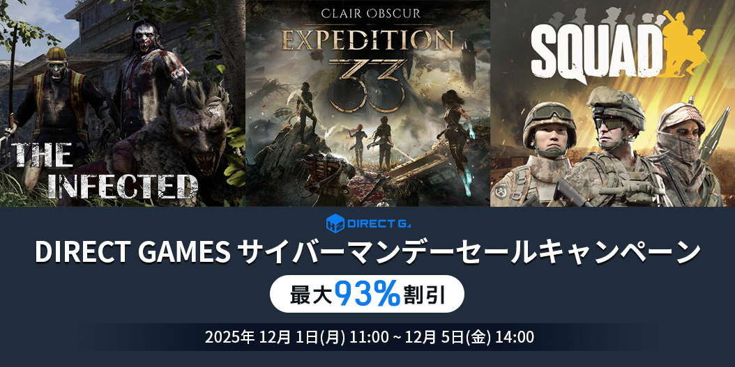 DIRECT GAMES サイバーマンデーセールキャンペーンでは、「The Infected」、「クレール・オブスキュール:エクスペディション サーティースリー」、「Squad」などを含め、その他にも多数の特価商品を用意したお得なキャンペーンですので、ぜひご確認ください!