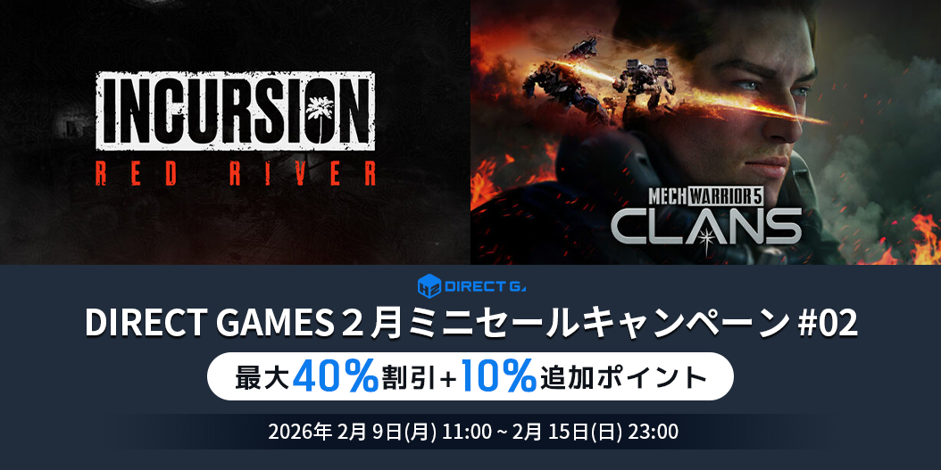 DIRECT GAMES2月ミニセールキャンペーン #02では、「Incursion Red River」、「MechWarrior 5: Clans」などを含め、その他にも多数の特価商品を用意したお得なキャンペーンですので、ぜひご確認ください!