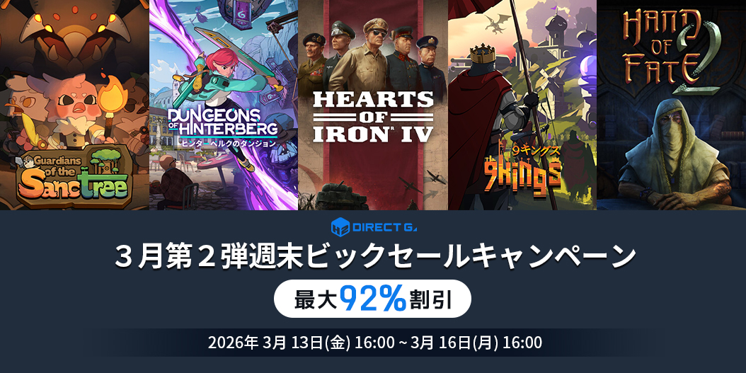 平素よりご利用いただき、誠にありがとうございます。3月13日の本日より、3月第2弾週末ビックセールキャンペーンを実施いたします。PCゲームデジタルキー公式販売サービス「DIRECT GAMES」では毎週末お得なイベントを開催しております。毎回、対象ゲームが変わるPCゲームユーザー必見のお得なキャンペーンですのでぜひご確認ください!