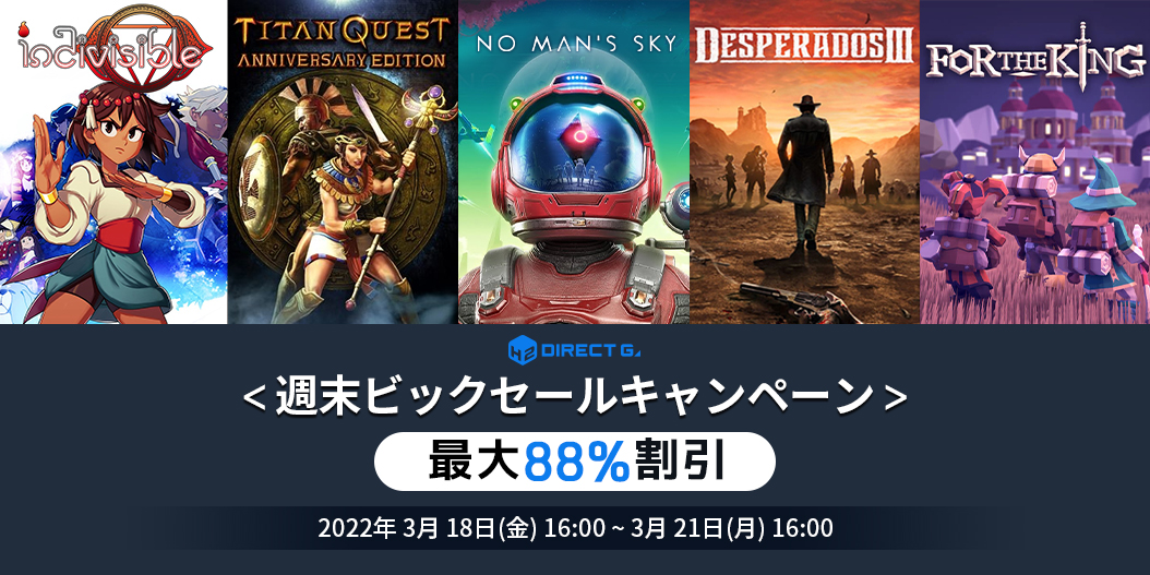 PCデジタルキー公式販売サービス「DIRECT GAMES」では毎週末お得なイベントを開催しております。毎回、対象ゲームが変わるPCゲームユーザー必見のお得なキャンペーンですのでぜひご確認ください!
