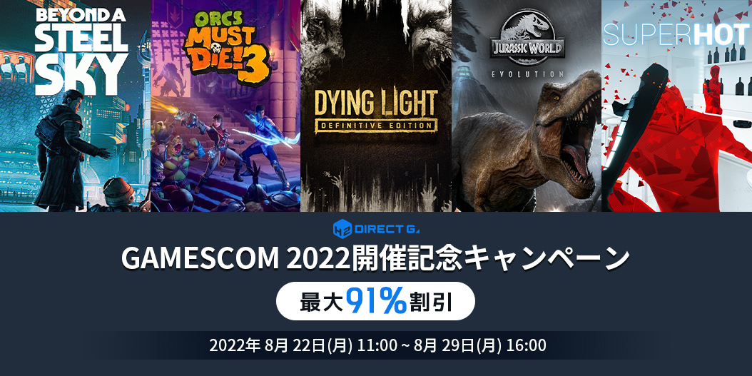 gamescom 2022開催記念キャンペーンでは、「Beyond a Steel Sky」「オークス・マスト・ダイ!3」「ダイイングライト Definitive Edition」「ジュラシック・ワールド・エボリューション」「SUPERHOT」などを対象に最大91%セールを行わせていただきます。お得なキャンペーンとなっておりますので、ぜひご確認ください!