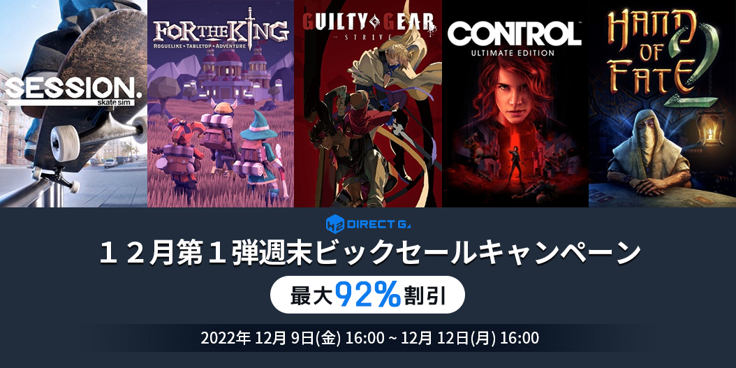 平素よりご利用いただき、誠にありがとうございます。12月9日の本日より、12月第1弾週末ビックセールキャンペーンを実施いたします。PCゲームデジタルキー公式販売サービス「DIRECT GAMES」では毎週末お得なイベントを開催しております。毎回、対象ゲームが変わるPCゲームユーザー必見のお得なキャンペーンですのでぜひご確認ください!